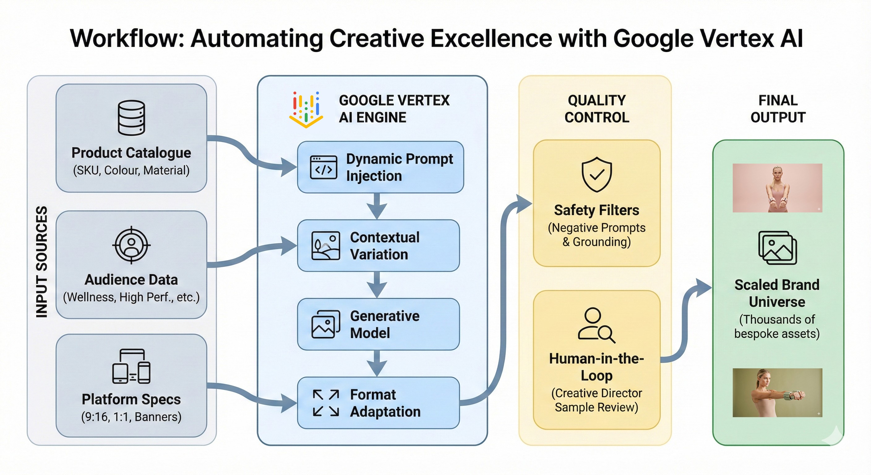 With Vertex AI, we don't crop. We regenerate. The system understands the compositional needs of each placement. It extends the background seamless paper, adjusts the depth of field, or moves the subject to ensure the asset is native to the platform it will live on. We are generating bespoke creative for every placement, not just resizing a master file.