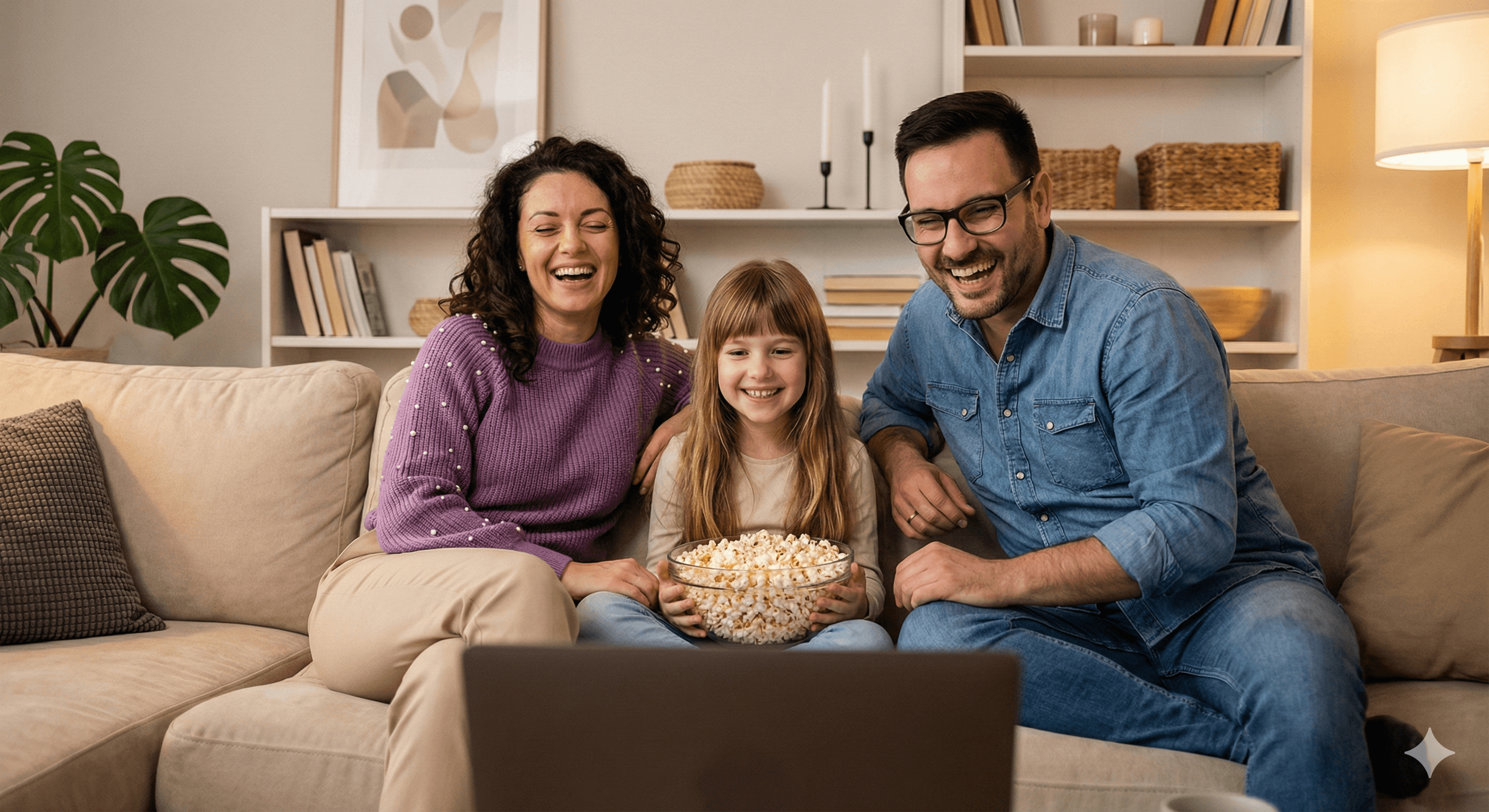 { "image_description": { "summary": "A candid, medium shot of a happy family of three sitting on a teal sofa in a cozy living room, eating popcorn and laughing while watching a movie on a laptop in the foreground.", "mood": "Joyful, cozy, domestic, heartwarming, intimate, candid." }, "subjects": [ { "id": "father", "demographics": "Adult male, Caucasian, mid-30s", "appearance": { "hair": "Short, dark brown, styled back", "facial_hair": "Light stubble/beard", "accessories": "Black-rimmed eyeglasses", "expression": "Broad, genuine laugh" }, "clothing": { "top": "Denim blue button-down shirt", "bottom": "Jeans (partially visible)" }, "pose": "Leaning slightly forward, sitting on the right side of the couch, looking at the screen." }, { "id": "mother", "demographics": "Adult female, Caucasian, mid-30s", "appearance": { "hair": "Dark brown, curly, shoulder-length", "expression": "Laughing with eyes closed, joyful" }, "clothing": { "top": "Mustard yellow knit sweater with pearl details", "bottom": "Beige trousers" }, "pose": "Sitting on the left, relaxed posture, looking towards the screen." }, { "id": "daughter", "demographics": "Young girl, approximately 6-8 years old", "appearance": { "hair": "Light brown/blonde, long, straight with bangs", "expression": "Smiling, engaged" }, "clothing": { "top": "Beige ribbed knit sweater", "bottom": "Blue jeans" }, "pose": "Sitting in the center between parents, holding a large glass bowl of popcorn." } ], "environment": { "location": "Modern living room interior", "furniture": { "sofa": "Plush, teal/green velvet sectional or sofa", "shelving": "White wooden shelving units with books and decor items in the background" }, "decor": { "wall_art": "Abstract framed print in neutral tones", "plants": "Green indoor houseplant (Monstera visible) to the left", "props": "Woven baskets on top shelves, candles" }, "foreground": "Blurred silhouette of a laptop screen or tablet" }, "lighting_and_color": { "lighting_type": "Warm indoor ambient lighting", "sources": "Soft lamp light from background, possible glow from the screen in front", "color_palette": [ "Teal", "Mustard Yellow", "Warm Beige", "Denim Blue", "Soft White" ], "tone": "Warm, inviting, 'Hygge' aesthetic" }, "technical_details": { "camera_angle": "Eye-level, straight on", "composition": "Rule of thirds, centered subjects", "depth_of_field": "Shallow (bokeh effect on background shelves and foreground laptop)", "focus": "Sharp focus on the family's faces", "style": "Lifestyle photography, cinematic realism, stock photography quality" } }