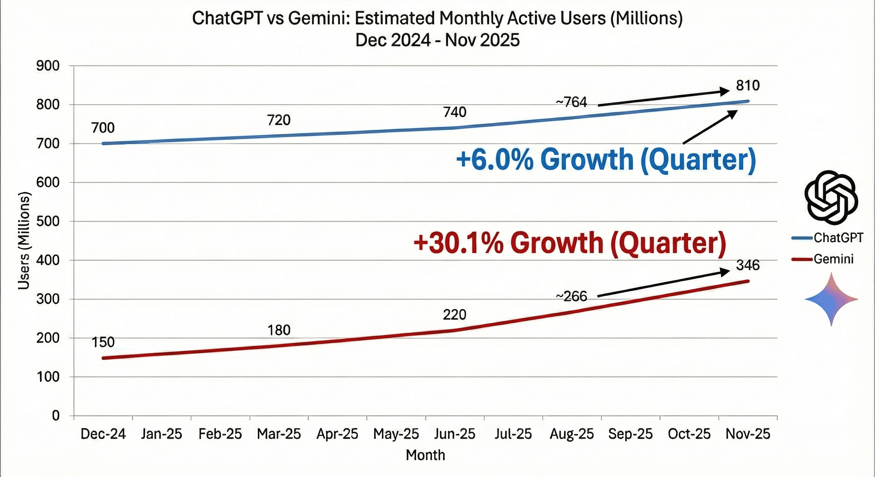If we project the current growth curves forward, the math becomes interesting. With ChatGPT nearing market saturation and Gemini accelerating due to ecosystem integration, the lines on the graph are set to intersect.