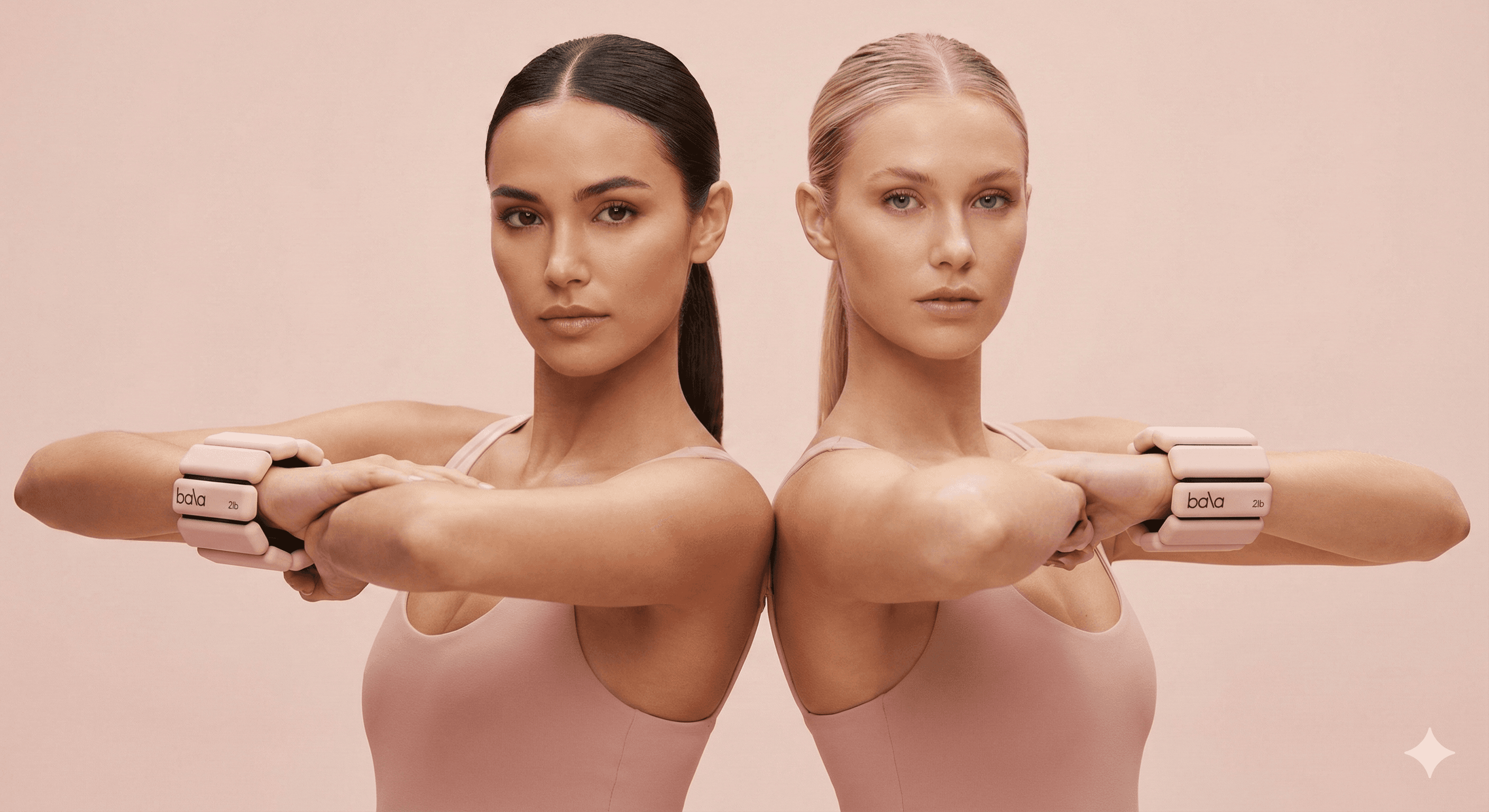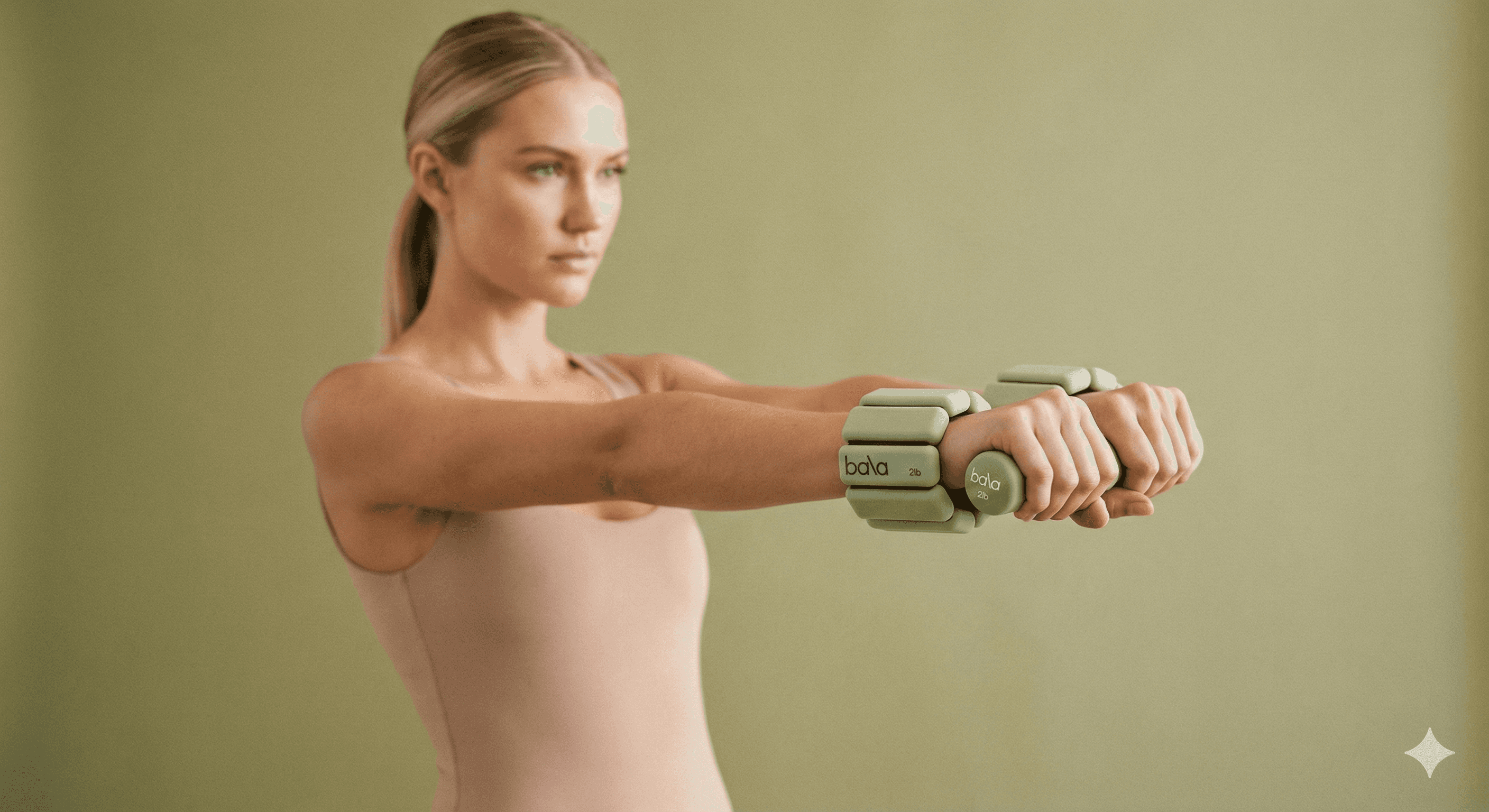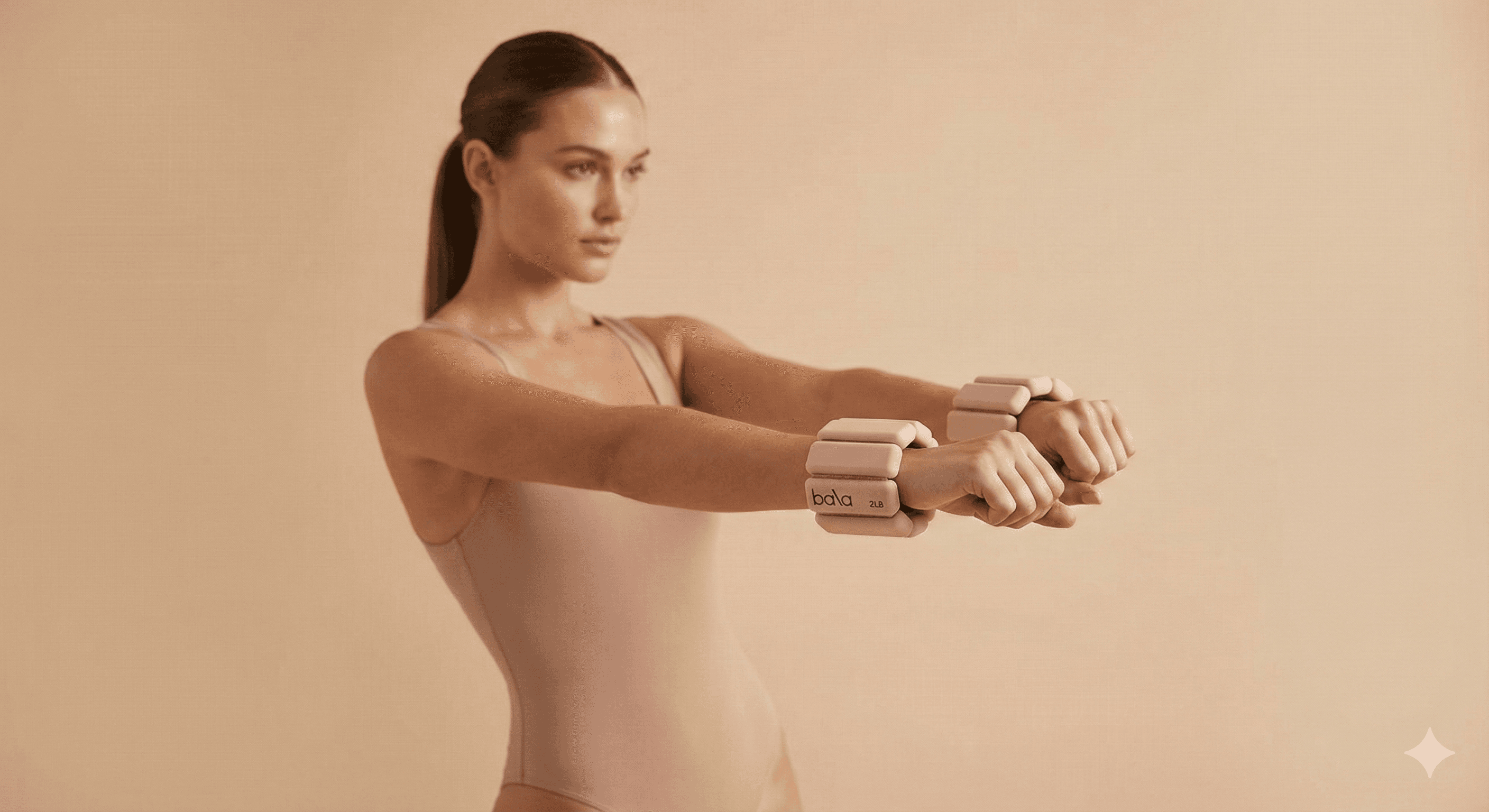 { "scene": "Studio photoshoot, soft warm beige seamless background, minimal editorial", "subject": "Female model standing, arms in shot, sleek ponytail, blush beige bodysuit", "product": "Blush beige Bala weights worn on wrists, visible logo, neutral 2lb model", "tech": "Soft studio lighting, 50mm f/2.8, 8k ultra photorealistic, shallow depth of field", "negative": "glasses, sunglasses, color mismatch, distorted anatomy, cartoon, low res" }
